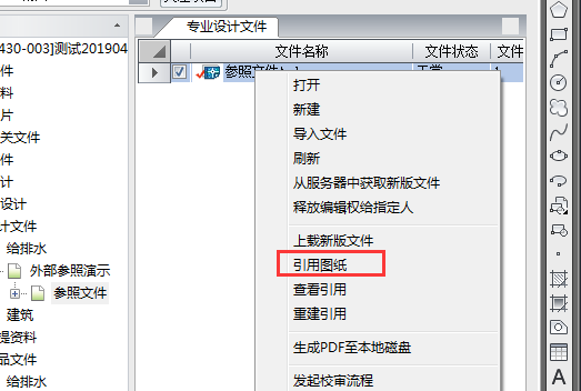 日常设计过程中,设计人员经常会使用到CAD的外部参照进行设计绘图,在协同平台中如果使用外部参照时要求通过右键菜单的【引用图纸】功能使用。
