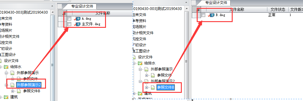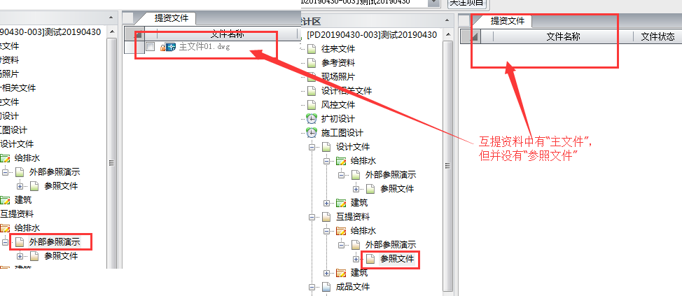 ⑤当选择主文件进行提资(或校审)后,主文件会进入“互提资料”目录中。由于本次并未对参照文件提资,因此参照文件并不会显示在“互提资料”目录中,但系统中记录有主文件与参照文件之间的关系,其他专业人员在查看“互提资料”中的主文件时,系统会自动找到对应的参照文件并加载到主文件中,以保证主文件内容的完整性。