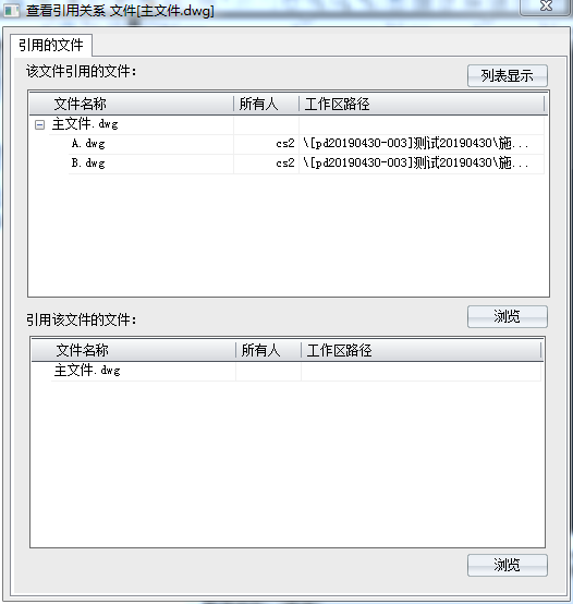 小结:对于在协同平台系统外使用外部参照设计绘图的图纸,要求外部参照使用相对路径,并将主文件和参照文件(含参照文件的文件夹)全部上传至协同平台后,再通过【重建引用】功能进行引用关系的建立。引用关系建立完成后,可以通过【查看引用】确认外部参照是否全部建立正确。完成引用关系建立的图纸,与在协同平台中引用的图纸完全一致,支持文件版本管理等功能。