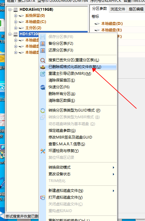 3、选择需要恢复数据的硬盘、右键选择红箭头所示选项,并且开始扫描