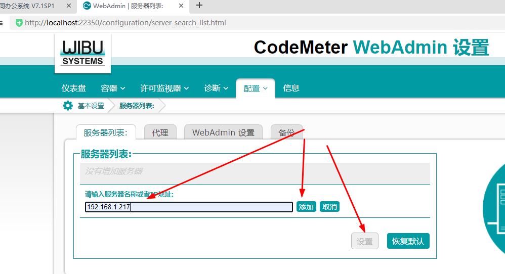 3、正常来说做完上一步就能用了,如果不能用则点击桌面右下角codeMeter图标,进入“web管理界面”,依次点击“配置”–“服务器列表”–“添加服务器”–输入192.168.1.217–“添加”–“设置”就行了