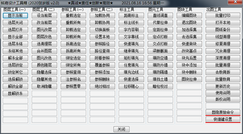 6、在命令行输入MJSJST即弹出工具箱页面或在cad上方标题栏出现铭嘉设计工具箱的字样,点击即为下拉菜单。